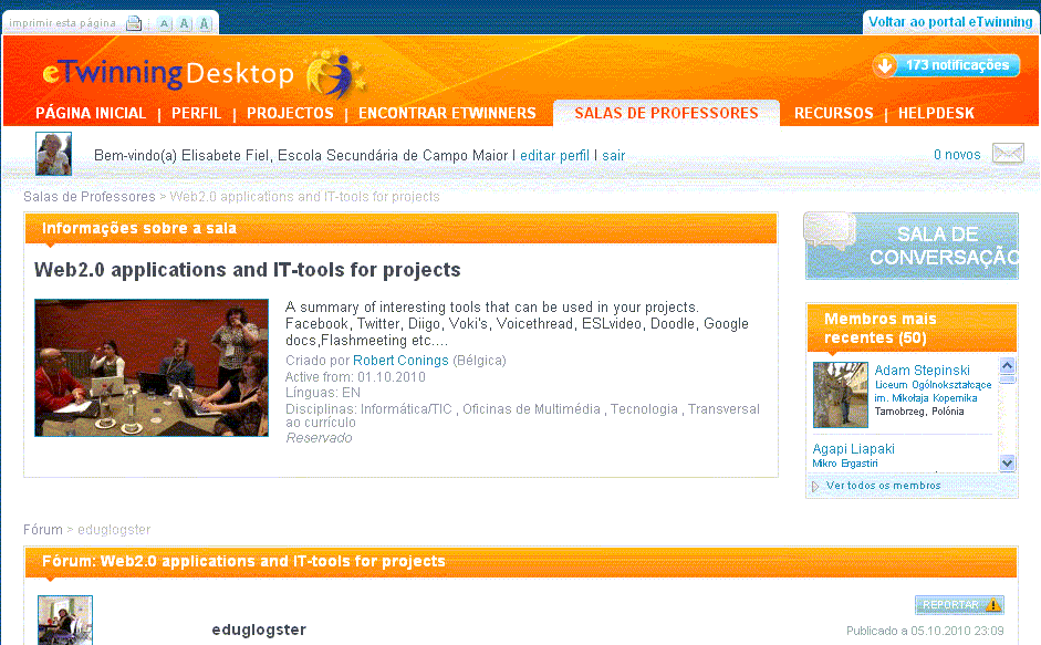 Elisabete Fiel* Projeto eTwinning Desde 2006 que realizamos projectos no âmbito do eTwinning, uma Comunidade das Escolas da Europa desde 2005, uma acção do programa eLearning, integrado no Programa Aprendizagem ao Longo da Vida baseado na geminação de escolas utilizando as Tecnologias de Informação e Comunicação (TIC). www.etwinning.net Este programa permite a partilha de experiências, através da geminação de escolas à distância, mas também o acesso aos «Grupos» e às «Salas de Professores» nas várias áreas do conhecimento. Enquanto professora bibliotecária modero o «Grupo das Bibliotecas Escolares» em parceria com as colegas: Patrice Sambou (francesa) e Itália Castiglione (italiana). Um grupo tem em comum as mesmas preocupações e assume-se como um espaço de partilha de boas práticas, de divulgação científica e didáctica, num ambiente restrito. É muito positivo saber que podemos inspirar outros e aprender novas formas de desenvolver actividades. http://groups.etwinning.net/web/school-librarians/home As salas de professores são um local onde se encontram professores de várias disciplinas e com quem podemos desenvolver projectos ou trocar experiências. A sala sobre WEB 2.0 apresenta imensas novidades com ferramentas para tornar as aulas mais criativas, a sala de Geografia revela-se interessante como forma de troca de experiências e parcerias para projectos. Mas, existem salas para todas às áreas curriculares, à distância de um click podemos descobrir outras formas de ensinar. A minha sala preferida…Web 2.0.