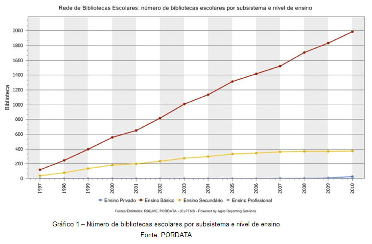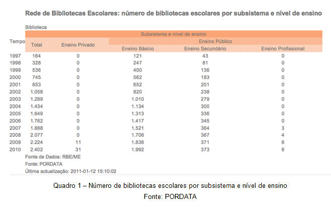 Dias e Maria Teresa Semedo Foram os resultados do PISA, lançado pela OCDE em 1997, com o objectivo de medir os níveis de leitura (literacia de leitura) dos jovens de 15 anos, que nos disseram que Portugal ocupava uma posição inferior à média europeia. Nos estudos realizados entre 2000 e 2006, os resultados dos alunos portugueses situavam-se significativamente abaixo da média da OCDE. Posteriormente, os dados divulgados entre 2006 e 2009 situaram Portugal na 21.ª posição, num conjunto de 33 países da OCDE. Mais recentemente, numa evolução francamente positiva, vemos que no Estudo do PISA de 2009 Portugal inclui o conjunto de países que alcançaram a média da OCDE, nos quais se incluem também o Reino Unido, a Dinamarca, a Suécia, a Alemanha, a França, a Irlanda e a Hungria. Desde 1997 que, à luz de orientações expressas internacionalmente ( IASL e a IFLA), Portugal e muitos outros países, assumiram compromissos para inverter a situação diagnosticada. Um ano antes, havia já sido lançado o Programa Rede de Bibliotecas Escolares (PRBE), pelos Ministérios da Educação e da Cultura, tendo por objetivo a instalação e desenvolvimento de bibliotecas em escolas públicas de todos os níveis de ensino, o que acontece a partir de 1997. Os utilizadores passaram a ter disponíveis os recursos necessários à leitura, ao acesso à informação em suporte analógico, eletrónico e digital. Hoje, decorridos quinze anos sobre o lançamento do Programa RBE, é certo que um novo conceito de biblioteca é partilhado pela generalidade das escolas. São bibliotecas híbridas, que conjugam o suporte material com o virtual, que incluem livros mas também recursos multimédia. Adaptadas à sociedade da informação e do conhecimento, elas procuram ser actuais e apelativas. O elo de ligação entre o Gabinete da RBE, as escolas e as diferentes parcerias locais são os coordenadores interconcelhios das bibliotecas escolares que coordenam um número de agrupamentos e escolas não agrupadas, a definir pela RBE, conforme as circunstâncias e a geografia do território, assegurando ainda o apoio técnico e pedagógico aos professores bibliotecários e às equipas das bibliotecas. Nas escolas, os professores bibliotecários asseguram o funcionamento e gestão das bibliotecas, as atividades de articulação com o currículo, de desenvolvimento das literacias e de formação de leitores – desde 2009, a criação da função do professor bibliotecário [Portaria n.º 756/2009] veio garantir a presença de recursos qualificados e especializados, nesta área. A integração das escolas, dos diferentes níveis de ensino, faz-se mediante um processo anual de candidatura. Às escolas selecionadas são atribuídos apoios financeiros destinados à execução de obras e reestruturação dos espaços, aquisição de mobiliário, equipamento audiovisual e informático e fundo documental. Atualmente, a RBE financia também a requalificação de bibliotecas escolares já integradas na Rede e alarga-se a outros públicos, designadamente escolas com contrato de associação com o ME e Instituições Particulares de Solidariedade Social. No território continental são hoje, na totalidade, 2471 bibliotecas escolares (não incluindo as regiões autónomas dos Açores e da Madeira, que têm programas próprios). O PRBE está envolvido nos projetos Ideias com Mérito, aLeR+ e Ler é para já, em parceria com o PNL, e Newton gostava de ler . Tem desenvolvido parcerias com o Plano Tecnológico para a Educação e, com especial relevância, o Plano Nacional de Leitura. Enquanto parceiro natural do Programa Rede de Bibliotecas Escolares, o Plano Nacional de Leitura, iniciativa do XVIII Governo Constitucional, pretende constituir uma resposta institucional à preocupação pelos níveis de literacia da população portuguesa, na generalidade e, em particular, dos jovens. Através do portal Web, o PRBE oferece um conjunto de serviços, a saber: blogue, newsletter, lista de difusão, Twitter, plataforma de aprendizagem e catálogos individuais das escolas. Nos últimos anos, têm vindo a ser desenvolvidas redes concelhias de bibliotecas com os respetivos portais e catálogos coletivos. A avaliação das bibliotecas escolares é feita através de um modelo desenvolvido por este Programa (instrumento de orientação e melhoria interna) que é aplicado em todas as escolas dos 2º e 3º ciclos e ensino secundário e nalgumas escolas do 1º ciclo e tem constituído um referencial de gestão. O Programa RBE foi objeto de uma avaliação externa, realizada em 2008, pelo Instituto de Ciências do Trabalho e da Empresa/Centro de Investigação e Estudos Sociais (ISCTE / CIES). De acordo com os dados fornecidos pela PORDATA, a evolução do número de bibliotecas integradas na rede, desde a sua criação, pode ser observada na tabela seguinte: