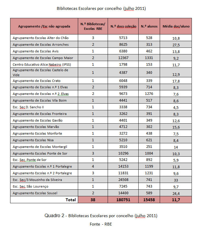 Bibliotecas escolares do Alto Alentejo integradas na RBE Num momento particularmente difícil para a vida das famílias, no que concerne à gestão dos orçamentos familiares e em início de mais um ano letivo, deixamos em aberto a reflexão sobre a ação social das bibliotecas escolares. Atentemos na média de documentos por aluno, nos diferentes concelhos