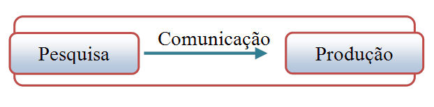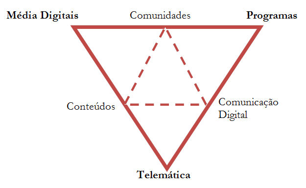 Terminamos assim, o percurso pelos vértices do triângulo maior, apresentando algumas soluções possíveis para implementar um curso na metodologia b-learning. Da mesma forma analisamos agora o triângulo mais pequeno, reconstruído a tracejado apenas para melhor se distinguir, no qual temos os vértices: conteúdos, comunicação digital e comunidades. Estes três vértices revestem-se maior complexidade, pelo que a planificação do curso on-line constitui a base para todo o processo de construção do conhecimento assente nas relações e interações desenvolvidas por uma comunidade de aprendizagem. Estas interações desenvolvem-se a vários níveis, nomeadamente formador/formando, formando/formando e formando /conteúdos. Quando preparamos os “conteúdos” é conveniente ter em conta o público-alvo, mas também que tipo de atividades queremos/podemos proporcionar. Pois, segundo Moran (2005) “há três campos importantes para o desenvolvimento de atividades virtuais: o da pesquisa, o da comunicação/interação e o da produção”(p.85). Ideia que sintetizamos na figura seguinte: