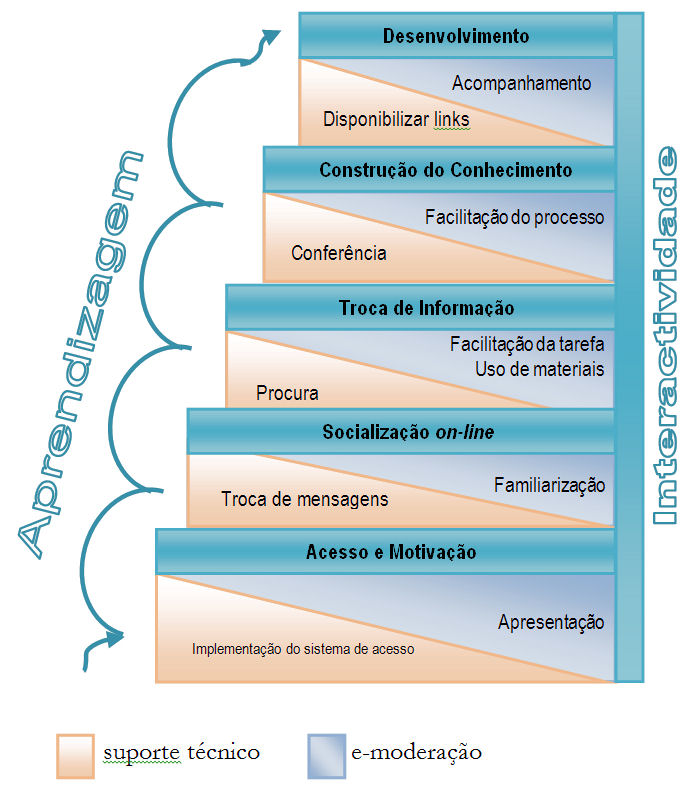 APDSI (2007). Glossário para a Sociedade de Informação. Associação para Promoção e Desenvolvimento da Sociedade da Informação. Consultado em Agosto de 2011 emhttp://www.apdsi.pt/main.php?mode=public&template=frontoffice&srvacr=pages_43&id_page=138. Boggino, N. (2009). A avaliação como estratégia de ensino. Avaliar processos e resultados. Sísifo. Revista de Ciências da Educação, 09, pp 79-86.Consultado em agosto de 2011 em http://sisifo.fpce.ul.pt. Correia, C. & Tomé, I. (2007). O que é o E-Learning. Lisboa: Ed. Plátano, 2007. Consultado em Agosto de 2011 em http://www.citi.pt/08_09_Mestrado/Semana_2/#-18. Dias, P. (2000). Hipertexto, hypermedia e média do conhecimento: representação distribuída e aprendizagens flexíveis e colaborativas na Web . Revista Portuguesa de Educação 13 (1). pp. 141 -167. Consultado em Agosto de 2011 em http://repositorium.sdum.uminho.pt/bitstream/1822/497/1/PauloDias.pdf Figueiredo, A. D. (1995).O Futuro da Educação perante as Novas Tecnologias. Consultado em Agosto 2011 http://eden.dei.uc.pt/~adf/Forest95.htm. Moran J. M (2005). A Pedagogia e a Didática da Educação on-line (pp. 67-93) in: Silva, R. V. e Silva, A. V. (org.) (2005). Educação, aprendizagem e tecnologia: um paradigma para professores do séc. XXI. Lisboa: Associação Portuguesa para a Gestão do Conhecimento e Edições Sílabo. Salmon, G. (2000). E-Moderating: The key to teaching and Learning Online. London, Kogan Page. Silva, R. V. e Silva, A. V. (org.) (2005). Educação, aprendizagem e tecnologia: um paradigma para professores do séc. XXI. Lisboa: Associação Portuguesa para a Gestão do Conhecimento e Edições Sílabo. [1] Adaptado de http://www.cibersociedad.net/public/coms3con/125_k3_ubf1pm.JPG, consultado em agosto 2011. [2][definição] Temática - Indústria relacionada com o uso de computadores, no contexto de sistemas de telecomunicações. Inclui serviços de ligação à Internet, como também a uma série de redes que dependem de sistemas de telecomunicações para transportar dados. [3] http://moodle.org [4] http://www.blackboard.com/ [5] http://www.dokeos.com/ [6]Fonte: http://www2.ufp.pt/~lmbg/reserva/msc_sa2005.pdf, acedido em agosto de 2011.